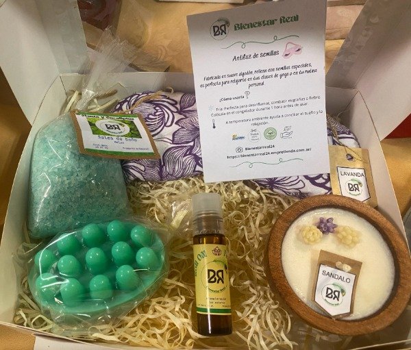Transforma tu tiempo de descanso con nuestro exclusivo box de relajación. Incluye un antifaz de semillas, una vela aromática de sándalo. Podés elegir entre otros complementos, esta tiene sales de baño de Menta, jabón de menta masajeador y con esponja vegetal, Roll On Frescura. ¡Es el momento perfecto para consentirte, despejar tu mente y disfrutar de un descanso verdaderamente reparador!